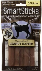 SmartBones SmartSticks are safe, digestible rawhide-free dog treats. Made with real chicken & peanut butter, they reduce tartar and are great for all dogs. Get our full review!