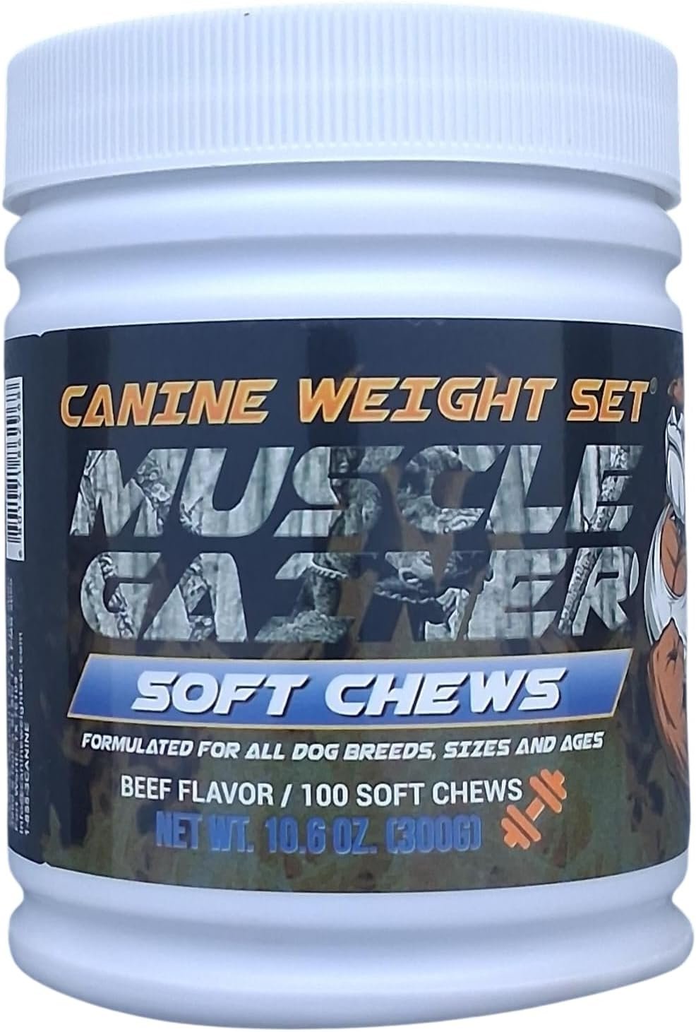 Review Canine Weight Set's 15-in-1 Muscle Gainer Dog Treats. See how these beef-flavored soft chews help active, senior, or underweight pups build muscle, boost immunity & joint health.