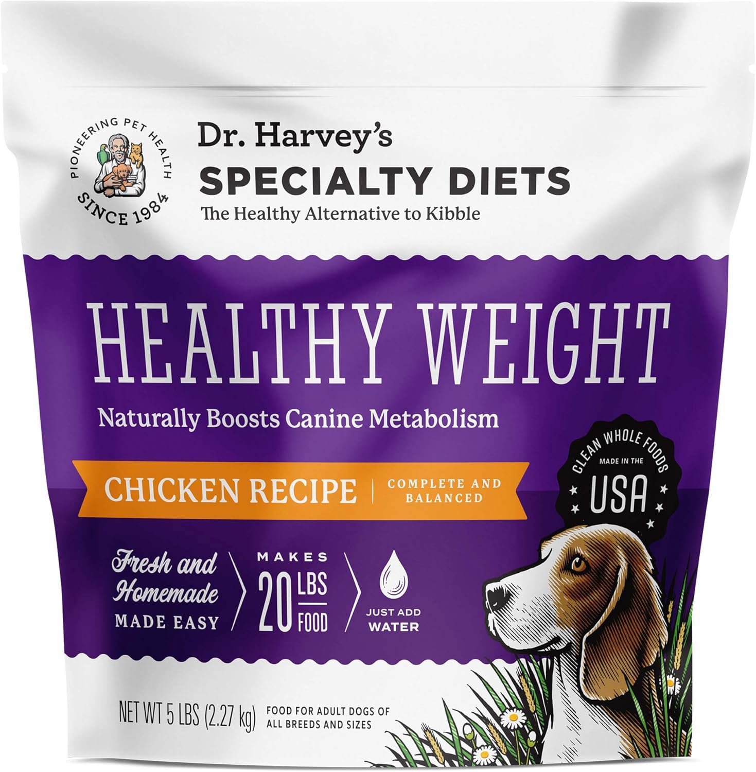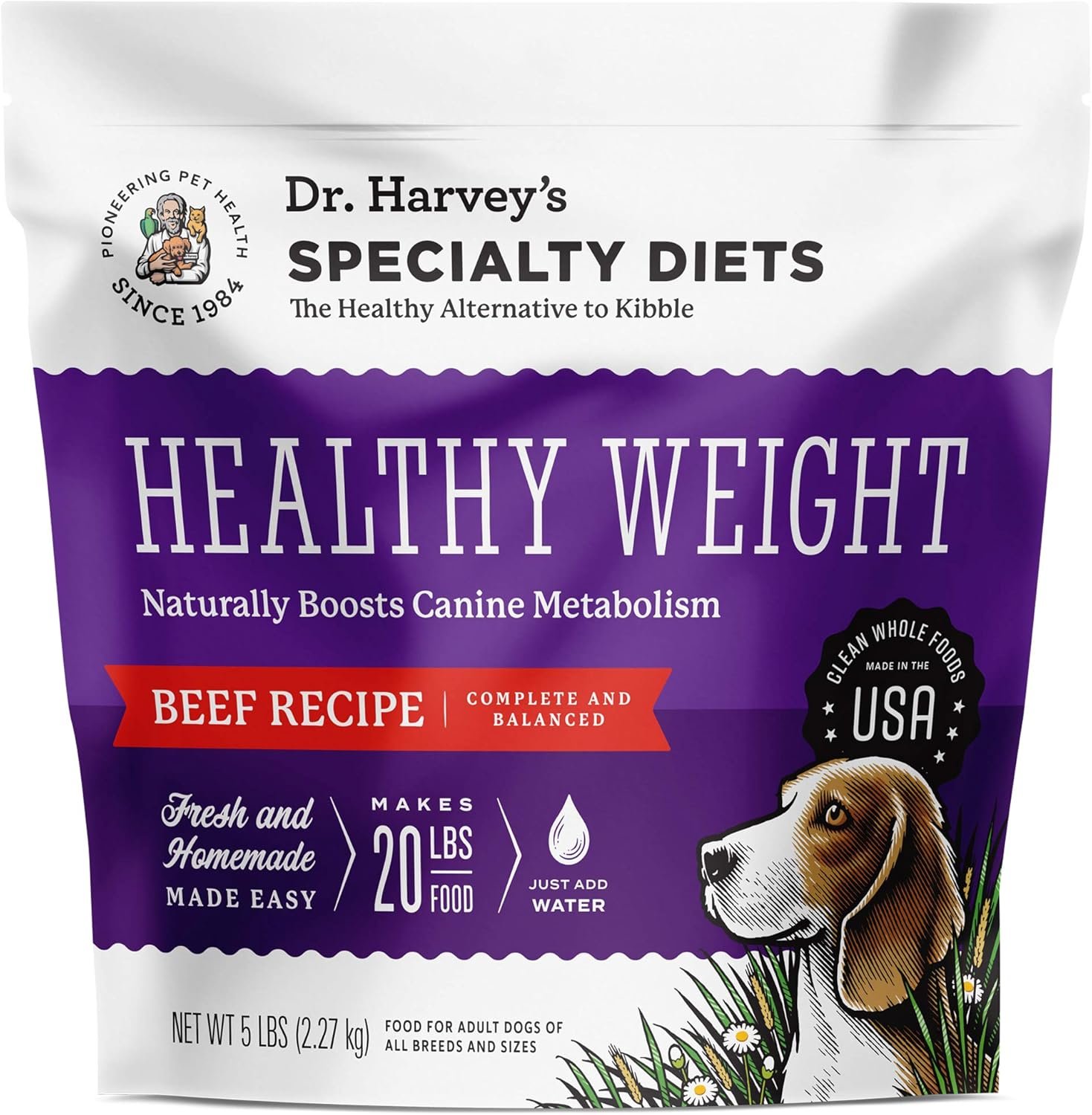 Review Dr. Harvey's Healthy Weight Beef Recipe. This human-grade dehydrated meal helps adult dogs lose weight naturally. Find the best healthy weight dog food for your pup!