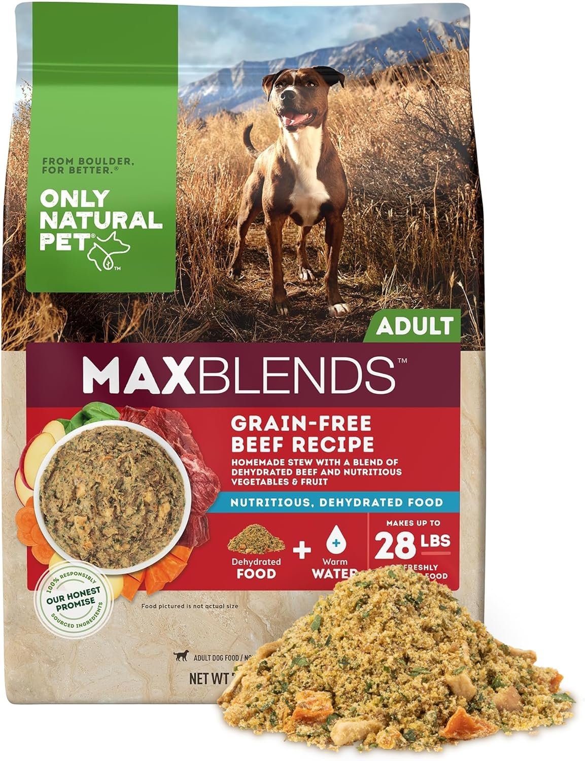 Review the Only Natural Pet MaxBlends Grain-Free Beef Dog Food. A premium, high-protein, dehydrated meal perfect for active adult dogs with grain sensitivities. Rated 4.8/5!