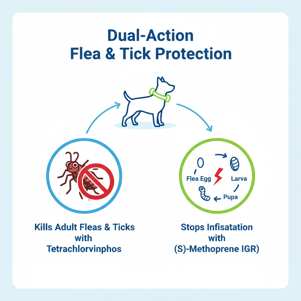 The collar uses a slow-release matrix containing 14.55% Tetrachlorvinphos to kill adult pests and 1.02% (S)-Methoprene to stop flea eggs and larvae from maturing. While only 5% of a flea population actually lives on your pup, this "extended-release" tech ensures that as your dog moves, the active ingredients move through the oils of the skin and coat to provide a protective shield. It starts working on contact, so pests don't necessarily have to bite your dog to die.