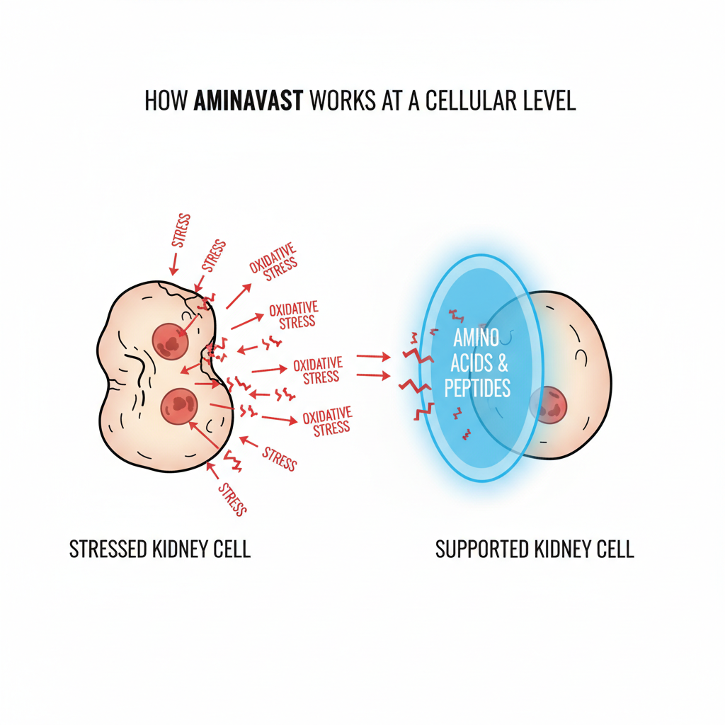AminAvast utilizes a patented ingredient called AB070597. This isn't a drug, but a highly specific concentration of amino acids and a peptide. These work together to support the natural structure of renal cells and maintain low levels of oxidative stress within the kidneys.