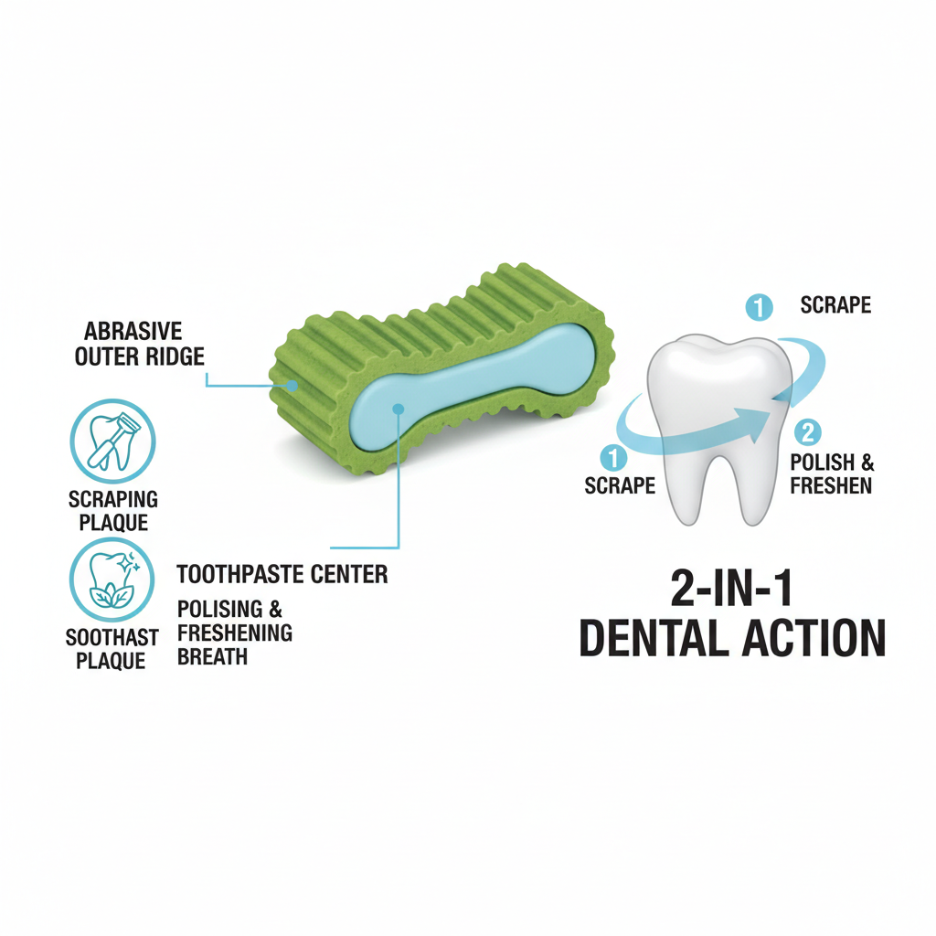 Unlike many "treats" that just use mechanical scraping, these chews feature a patented design. The outer ridge scrapes away the gunk, while the soft inner core acts like a toothpaste to polish the enamel. It uses natural helpers like honey and sodium bicarbonate to tackle the chemistry of plaque.