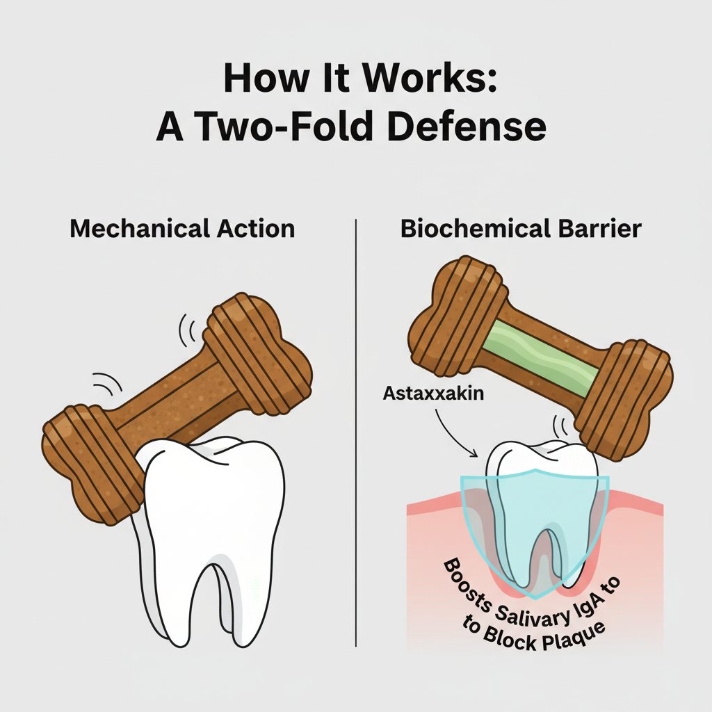 The star of the show here is Astaxanthin. Our research into the formula shows it boosts immunoglobulin A in the dog’s saliva. This basically turns their spit into a protective shield against plaque. It also contains honey and cinnamon to fight bacteria naturally.