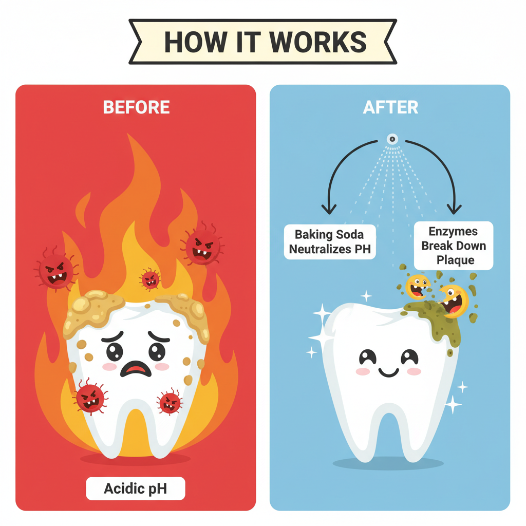 Key Ingredients Baking Soda, Enzymes (Lysozyme, Proteases), Zinc Gluconate, Green Tea Extract
