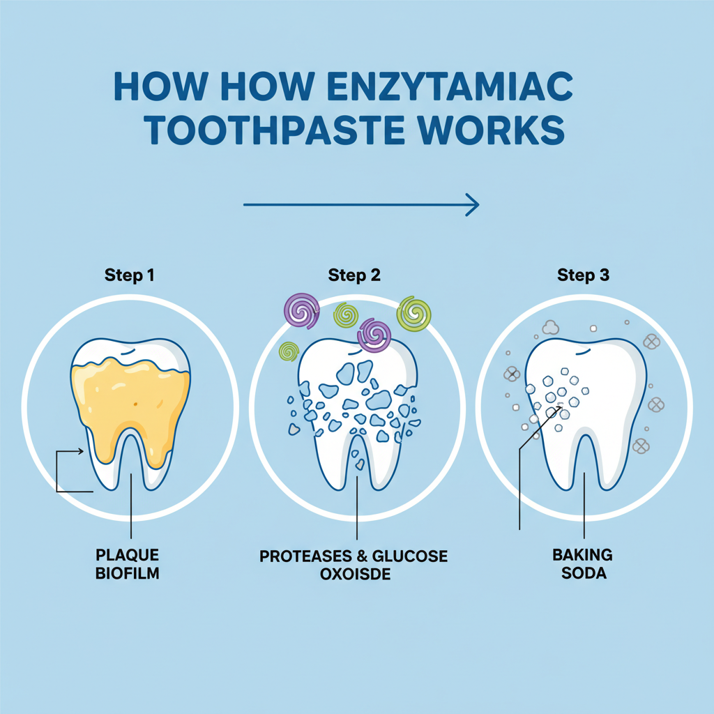 This isn't just a flavored paste. The enzymes (proteases and glucose oxidase) actually work to break down the proteins that allow plaque to stick to teeth. The addition of baking soda helps scrub away surface stains and deodorize the mouth at a molecular level.