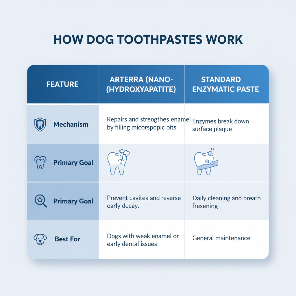- The star of the show is Nano-Hydroxyapatite (nHA). This isn't just a tongue-twister; it’s a mineral that makes up about 97% of tooth enamel. Arterra uses it to fill in tiny "potholes" in your dog's teeth before they turn into full-blown cavities. It also packs Green Tea Extract to fight bacteria and Baking Soda for gentle scrubbing.