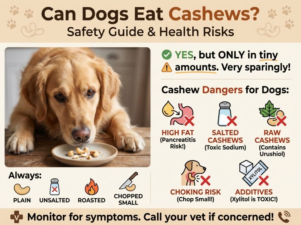 - Too Much Fat: Cashews are high in fat. A little fat is fine, but a lot can lead to an upset stomach, causing vomiting and diarrhea. Worse, it can trigger pancreatitis, a serious and painful inflammation of the pancreas that needs immediate vet attention.
