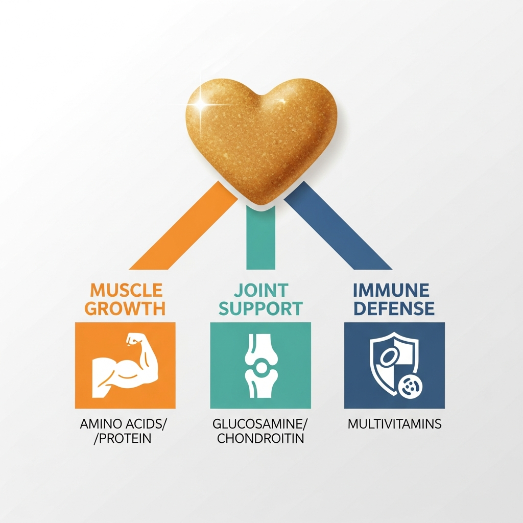 These chews are built around a "15-in-1" philosophy. Our team at Petscarelab found that the formula focuses heavily on amino acids and high-quality proteins to fuel muscle repair. Beyond just "bulking," it includes ingredients aimed at hip and joint support, which is a massive plus for larger breeds prone to stiffness.