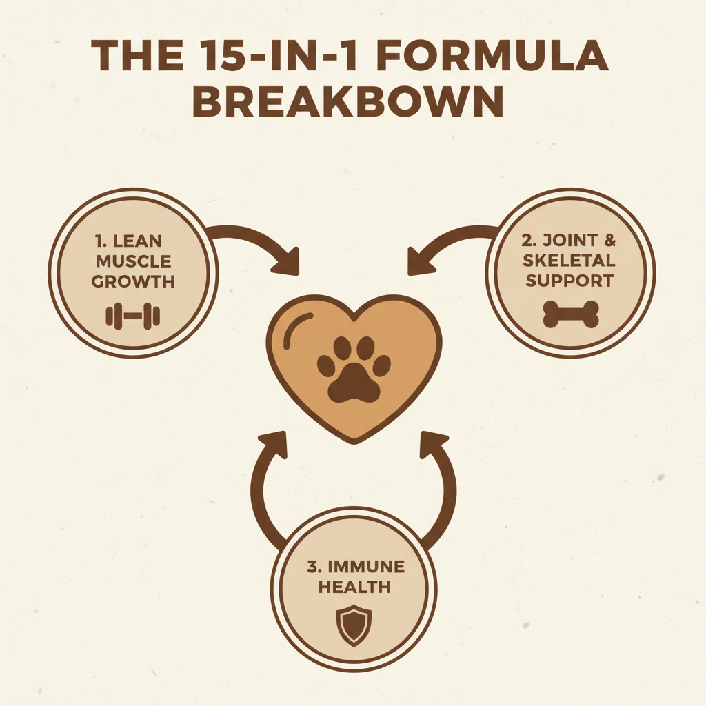This supplement isn't just about protein. It utilizes a blend of amino acids—the "bricks" of the body—to facilitate muscle protein synthesis. Our team at Petscarelab found that the 15-in-1 formula targets more than just biceps; it includes ingredients aimed at immune health and skeletal support, ensuring that as the muscle grows, the frame can support it.