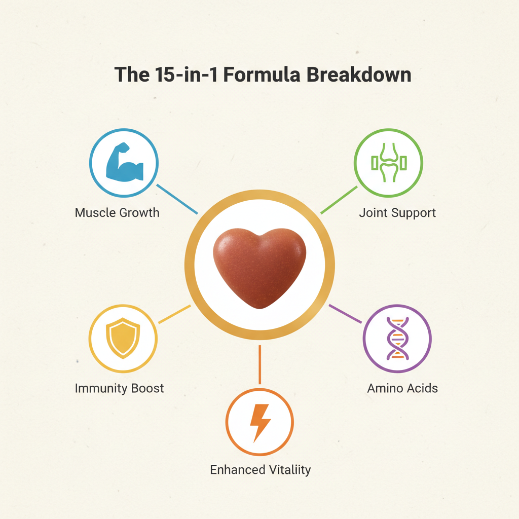 Main Facts: The 15-in-1 formula is the heavy hitter here. Our team at Petscarelab found that it focuses heavily on amino acids—the building blocks of protein—to help repair and grow muscle tissue. It also doubles as a hip and joint supplement, which is a huge plus since extra muscle weight needs strong joints to support it.