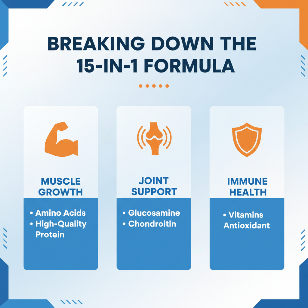 This isn't just a basic treat. The "15-in-1" label refers to a blend of amino acids—the building blocks of protein—which are essential for tissue repair and growth. While many supplements focus only on weight, this one aims for lean mass.