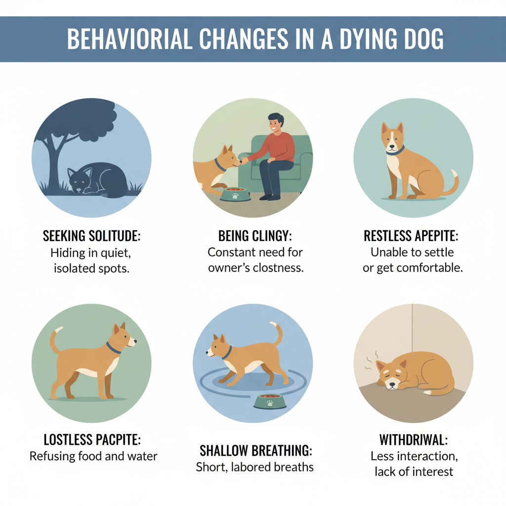 When a dog is dying, they often show a range of behavioral changes. These actions don't necessarily mean your dog knows they're dying like we do. Instead, they’re often a reflection of how their body feels and deeply ingrained instincts kicking in.