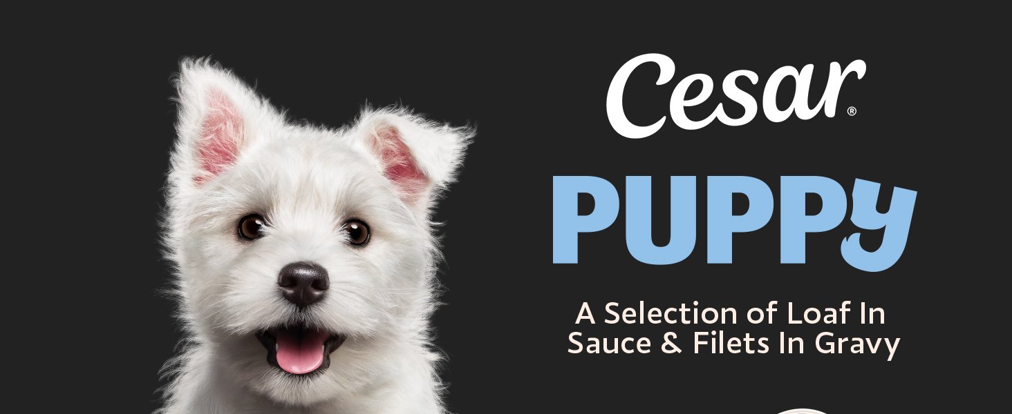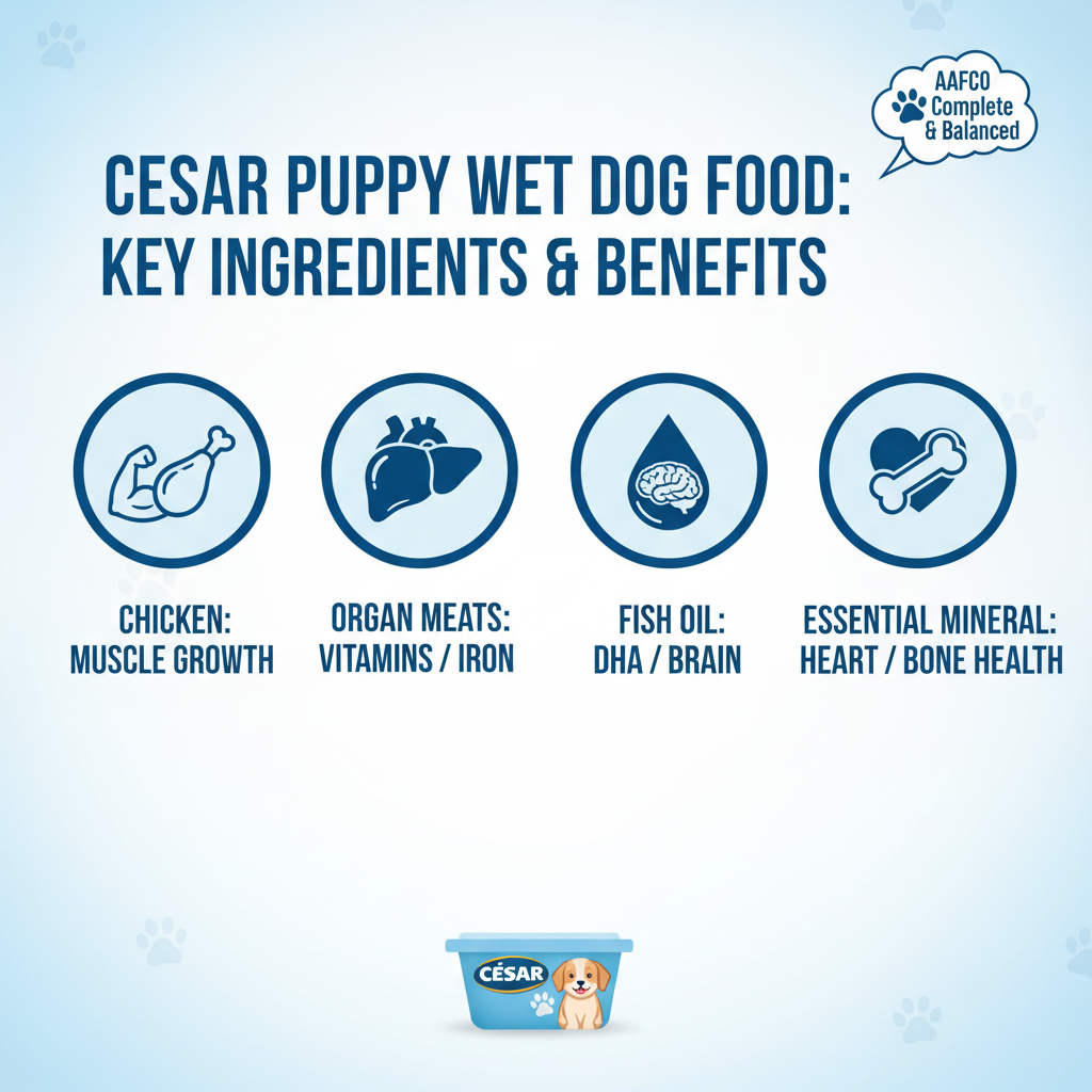 The Cesar Puppy Wet Dog Food Variety Pack is a high-protein, gourmet wet food designed for all breed sizes, providing essential nutrients like calcium and potassium for heart and bone health in growing pups under 12 months.