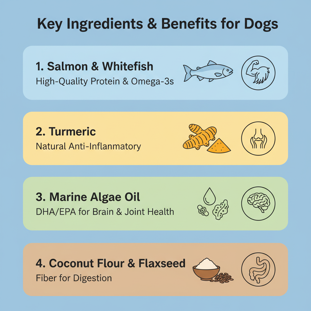 - Salmon & Whitefish: These are the first two ingredients. They provide high-quality protein and are naturally rich in Omega-3 fatty acids, which help keep your dog's coat shiny and their skin hydrated.