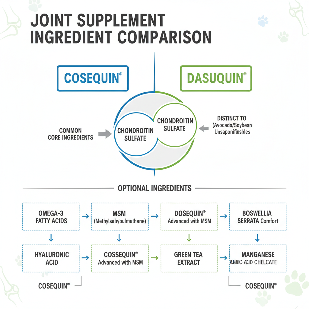 The primary distinction lies in Dasuquin’s inclusion of avocado-soybean unsaponifiables (ASUs). ASUs work by diminishing inflammation and stimulating the repair of damaged cartilage, boosting the joint-protective effects of glucosamine and chondroitin for maximum benefit.