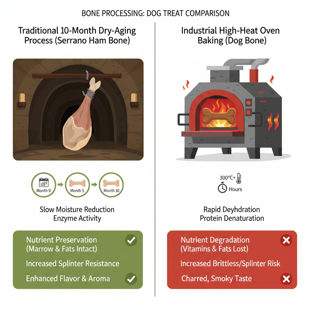 The Country Kitchen Genuine Serrano Half Ham Bone stands out because of its simplicity and traditional preparation. Our research confirms these are 100% single-source pork bones, specifically sourced from Serrano ham. Unlike many cheap treats that are flash-cooked in high-heat ovens, these bones undergo a 10-month dry-aging process. This patient, low-temperature method is a win for nutrient preservation, as it keeps the natural marrow and healthy fats intact without the "brittle" effect often caused by industrial baking. The traceability is clear—it's real ham, not a processed "bone-like" composite.
