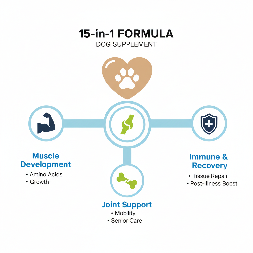 The "15-in-1" label isn't just marketing fluff. It combines amino acids—the building blocks of muscle—with ingredients designed to help with tissue repair and immune defense. This is especially vital for dogs that are physically active or those needing a boost after a surgery or long illness.