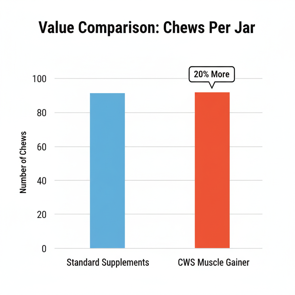It’s a 10/10 for convenience and application. There’s no powder to mess with and no pills to hide in peanut butter. You just grab a muscle supplement chew and go.