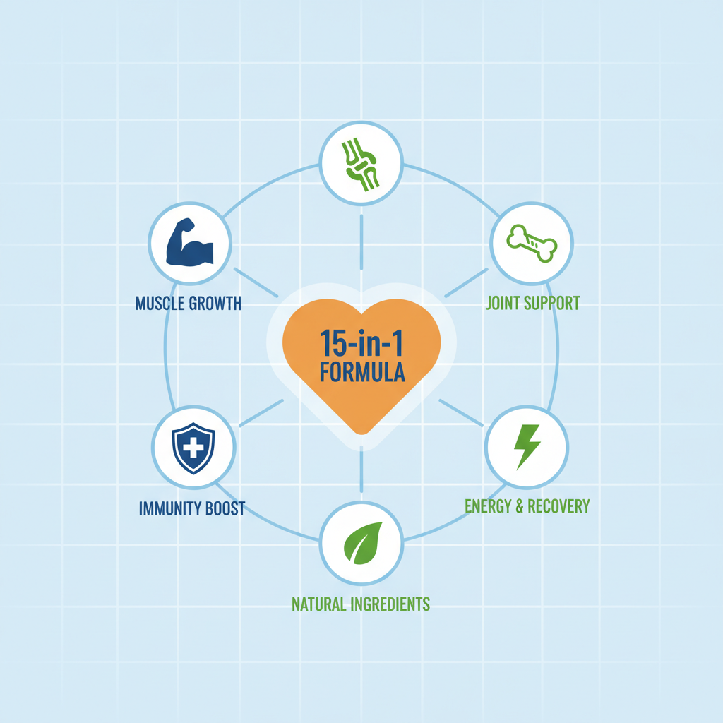 This supplement is built around a 15-in-1 formula. While the specific list of all 15 ingredients is proprietary, it focuses heavily on amino acids—the building blocks of muscle. It’s designed to fill the nutritional gaps that standard dog food often misses, especially for dogs with high metabolic needs.