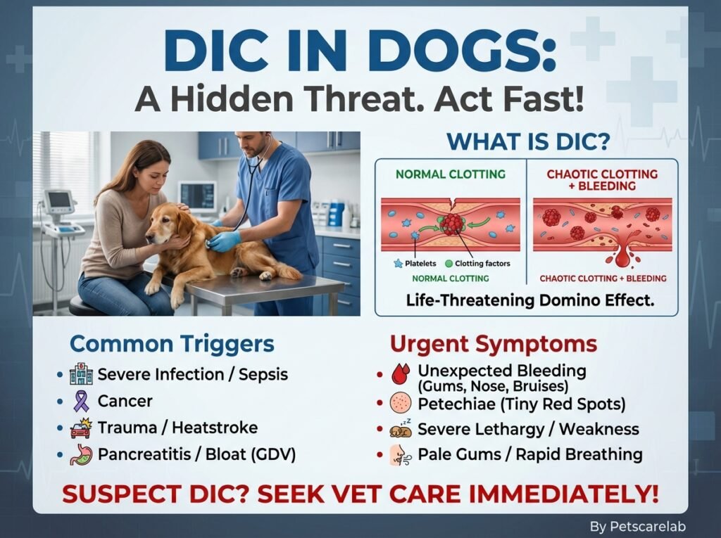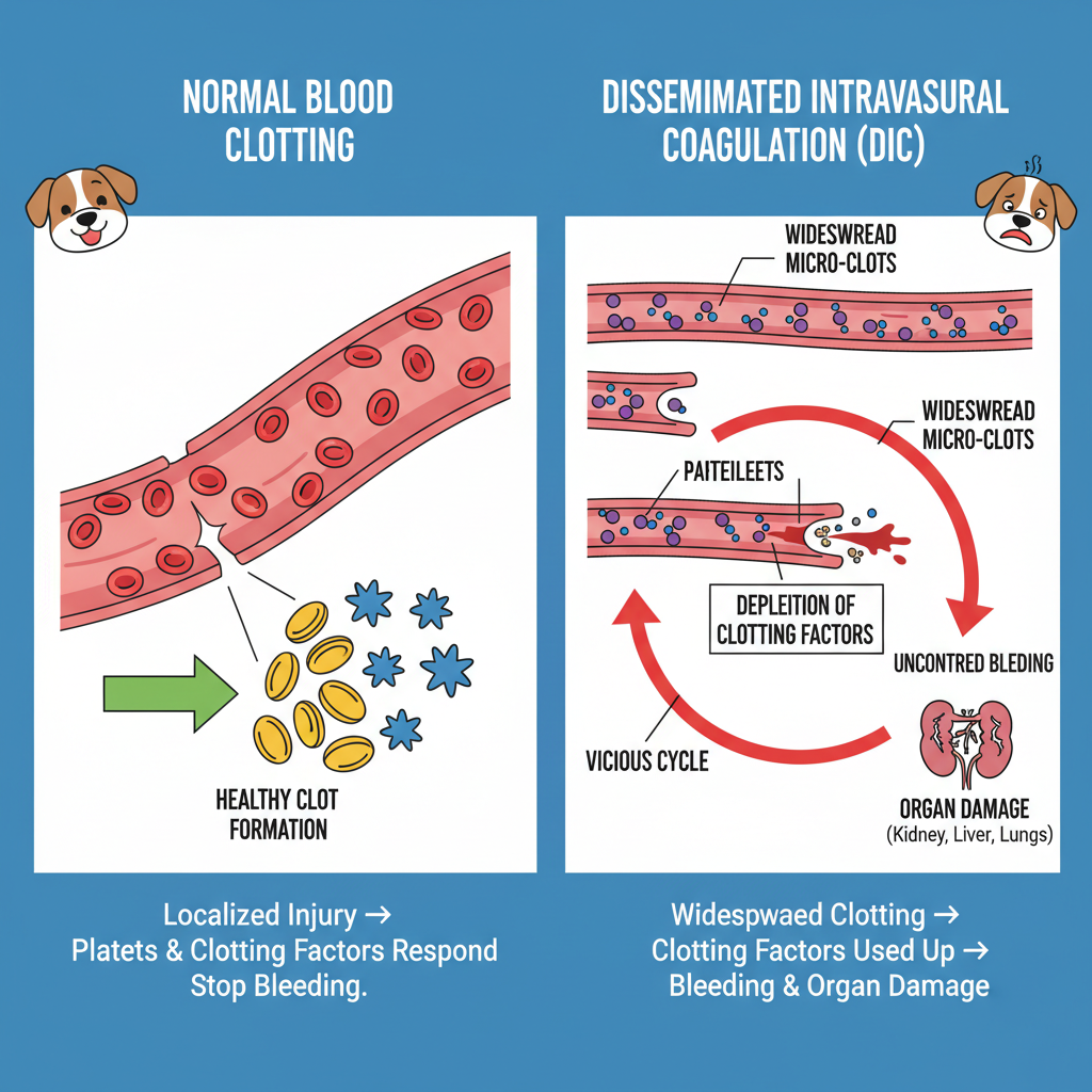 DIC essentially throws your dog's natural clotting system into chaos. Normally, when your dog gets a cut, their body sends out special "clotting factors"—like tiny construction workers and building materials (platelets and proteins)—to quickly patch things up. But with DIC, these workers go into overdrive, building countless tiny clots everywhere, even where they're not needed. This frenzy rapidly uses up all the building materials. Soon, there's nothing left for actual emergencies. So, your pup ends up with dangerous clots blocking blood flow to vital organs AND can't stop bleeding from even minor injuries, or worse, bleeding internally. It’s a vicious cycle that can quickly damage organs.