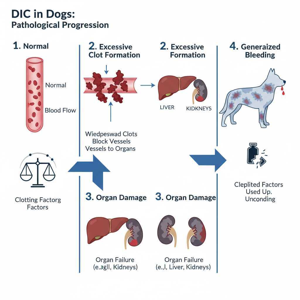 Disseminated intravascular coagulation (DIC) is a complex and serious medical condition in dogs. It occurs when the blood’s clotting mechanism goes into overdrive, leading to the formation of clots that can block vital blood vessels supplying critical organs like the liver and kidneys. This clogging reduces blood flow, potentially causing severe organ damage that can escalate to multiple organ failure and even death. Once the body exhausts its supply of clotting factors, dogs may exhibit bruising and bleeding from areas such as the gums and nose.
