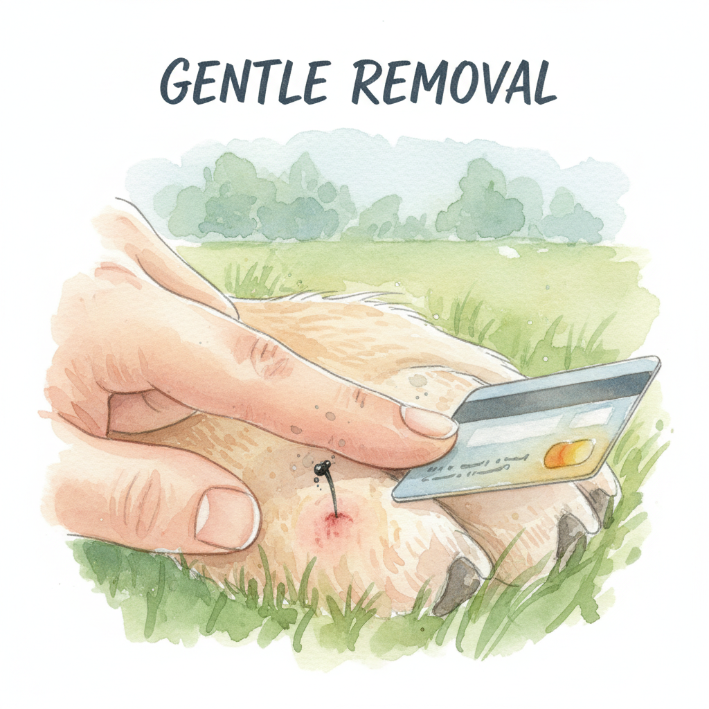 Start by gently looking for the sting site. You might spot a tiny black dot — that's the stinger. You'll want to remove it without squeezing it, as that can push more venom into your dog's skin. The best way to get it out is to scrape it away. Use the edge of a credit card, a dull knife, or even your fingernail. Just don't use tweezers; they tend to squeeze the venom sac.