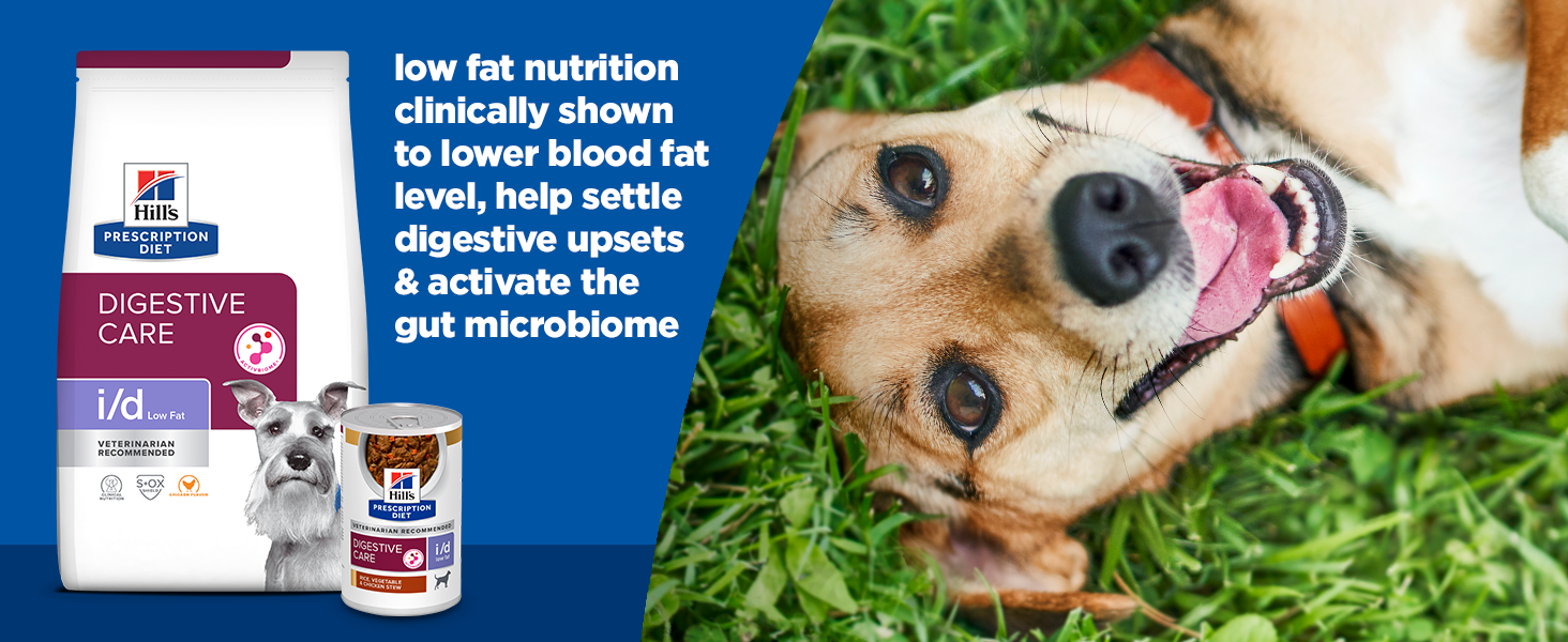 Hill's Prescription Diet i/d Low Fat is a specialized veterinary stew featuring highly digestible proteins and a breakthrough prebiotic blend designed to settle digestive upsets and support gut health in adult dogs of all breeds, especially those suffering from pancreatitis or fat-sensitive GI issues.