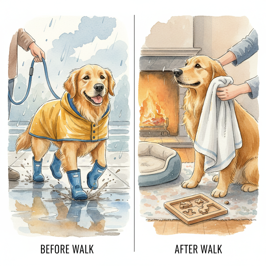 - Limit outdoor time: Keep walks short and focused when it's pouring.
