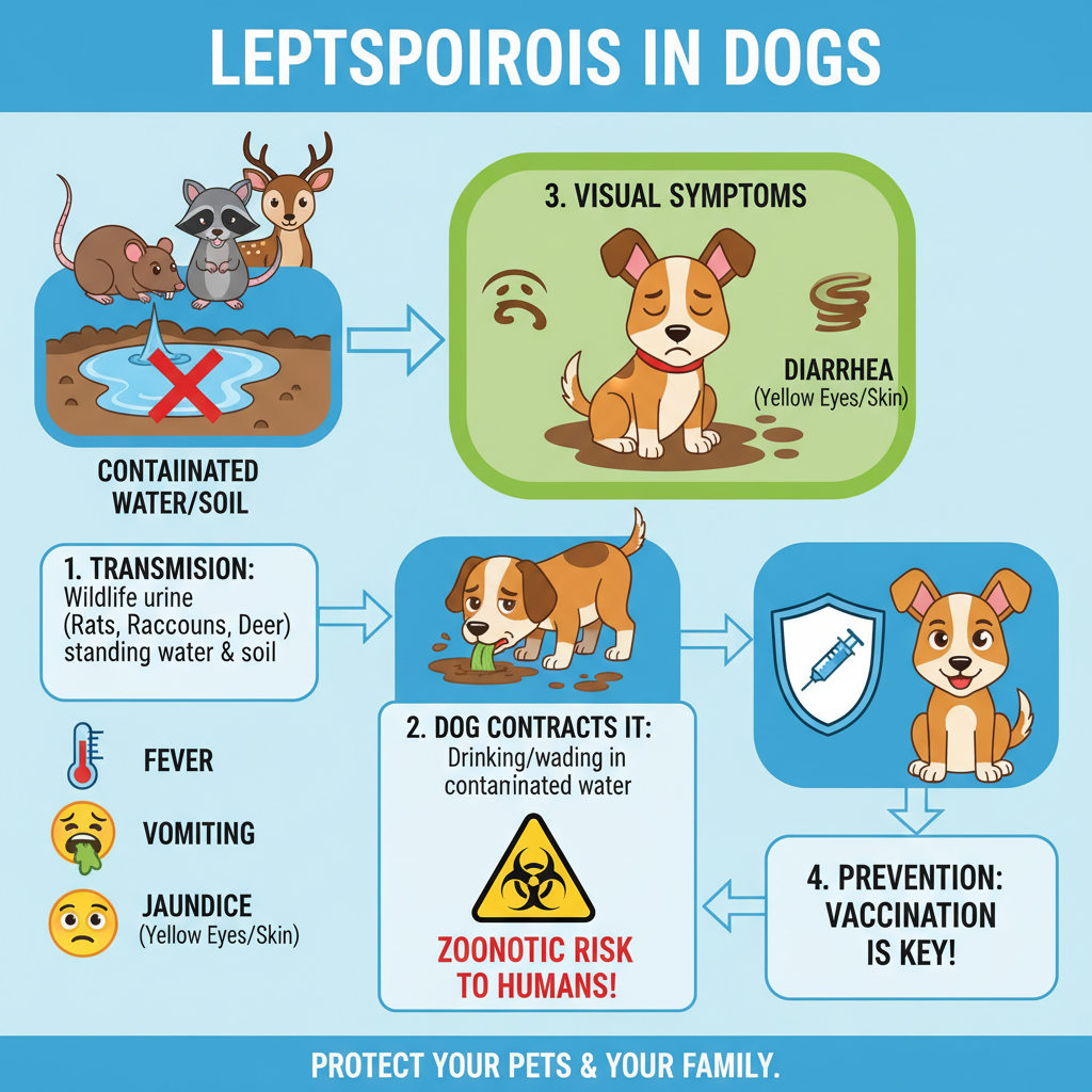 Leptospirosis is a nasty bacterial disease that can hit both pets and people. It usually spreads when dogs come into contact with the urine of infected wildlife (like rats, raccoons, or deer) in dirty water or soil. Rainy weather makes the risk even higher, since standing water and floodwaters are perfect places for this bacteria to hang out.