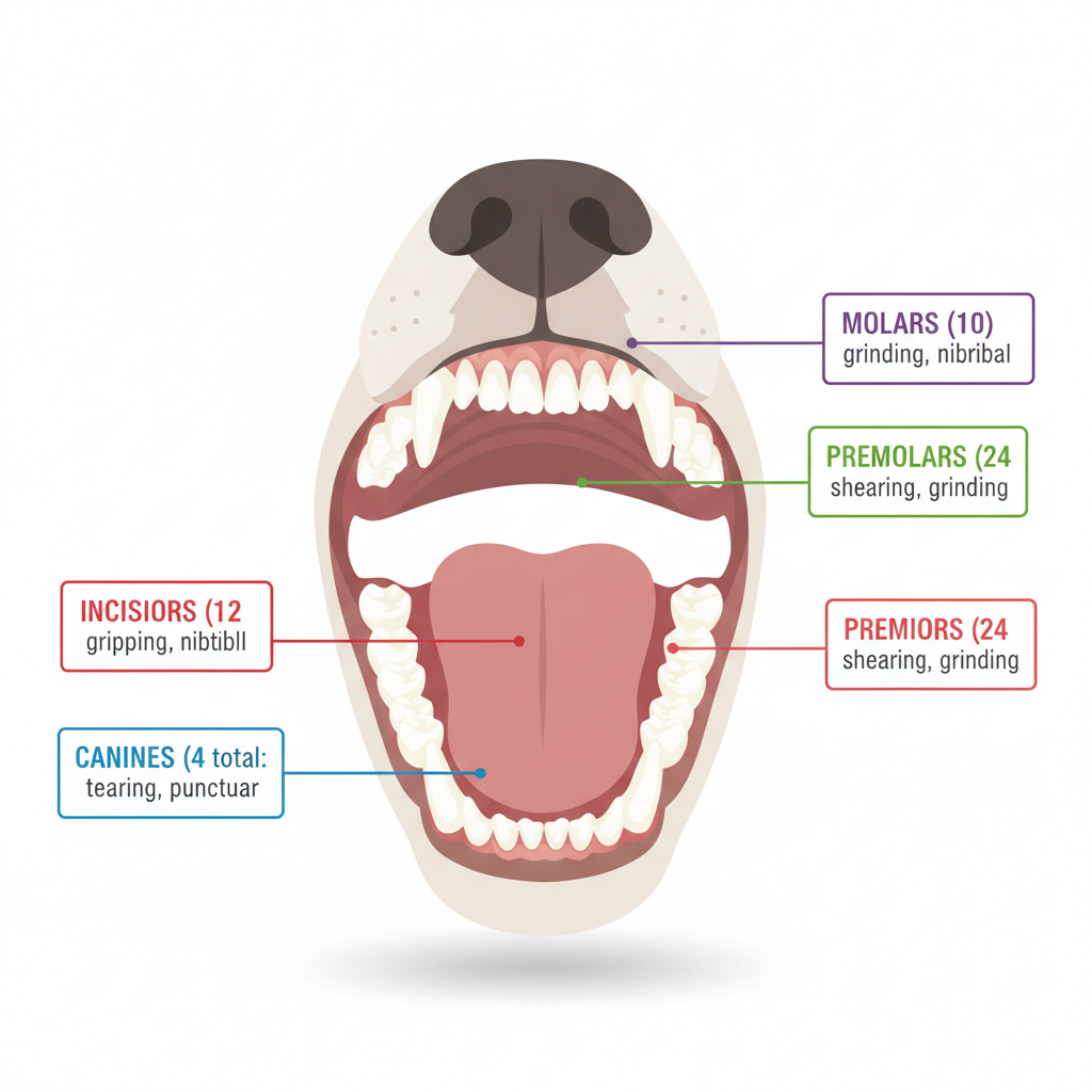 Dogs have several types of teeth, each built for a specific task—from biting to grinding. Here’s an overview of the different types of teeth in a dog’s mouth and their roles: