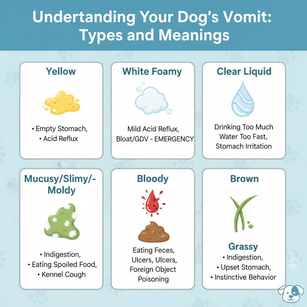 Here are some common types of vomit seen in dogs and what they might signify: