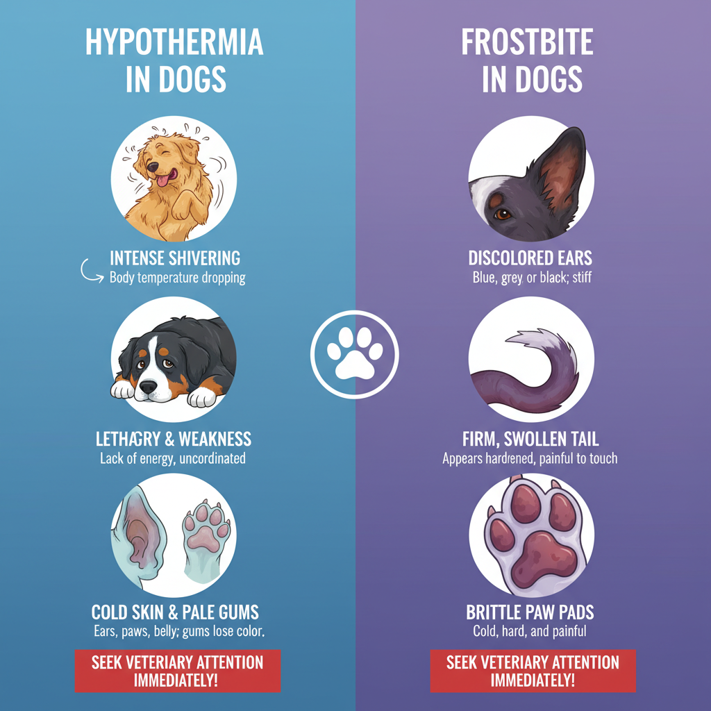 You've got to be aware of the warning signs. Watch for shivering, lethargy, cold skin, or pale gums. If you spot these, get to the vet immediately. Hypothermia happens when a dog's body temperature drops too low, and frostbite occurs when tissue freezes, which can cause permanent damage.