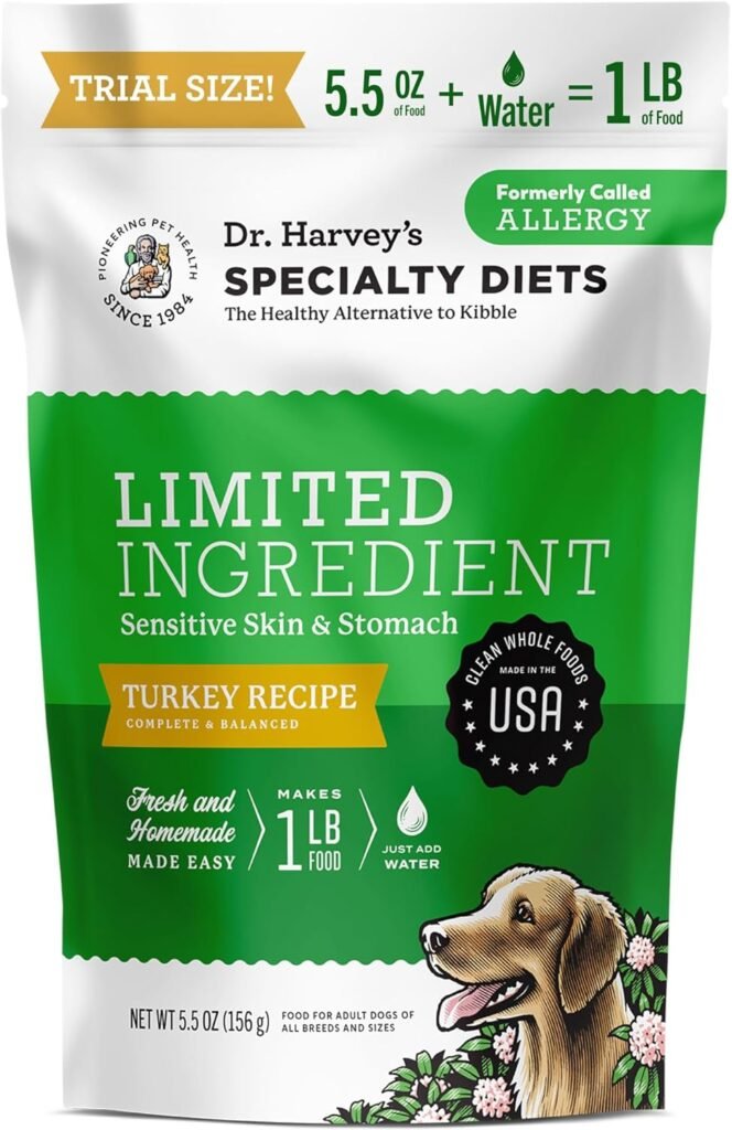 Dr. Harvey’s Limited Ingredient Turkey Recipe is a 4.5-star human-grade dehydrated food for adult dogs. It features raw turkey and limited ingredients, ideal for sensitive pups with itchy skin or upset stomachs.