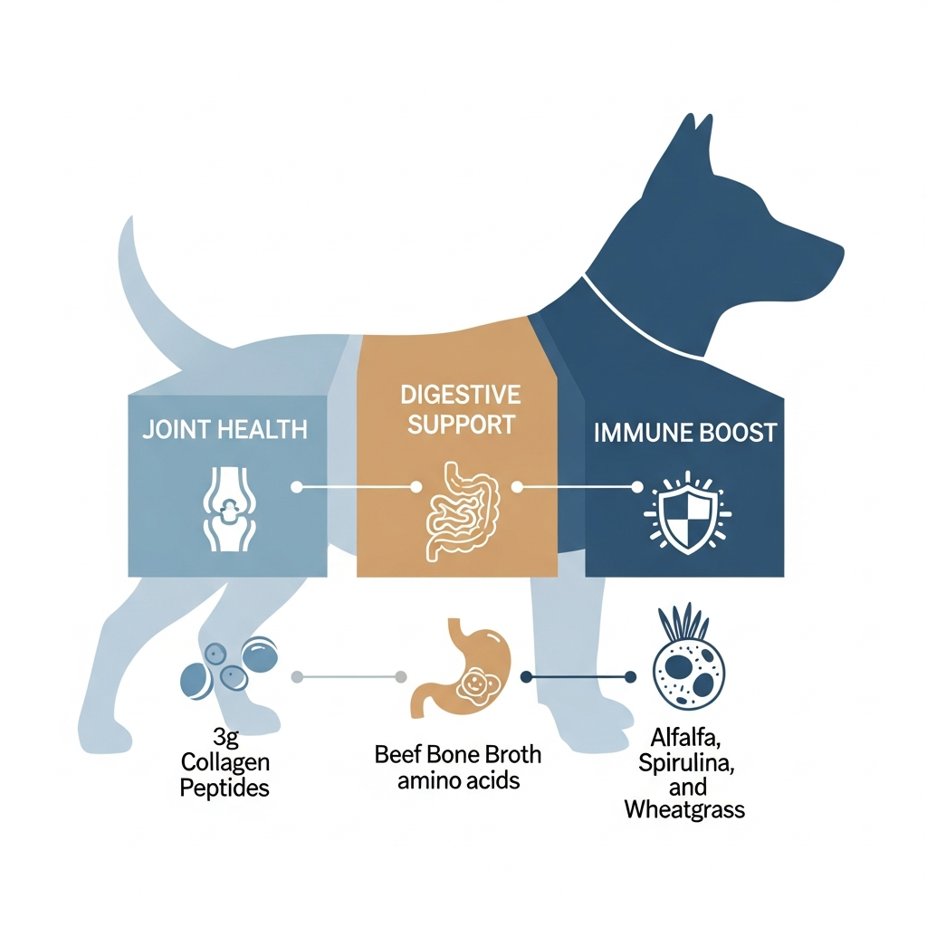 When our team at Petscarelab looked at the label, the first thing that jumped out was what wasn't there. You won't find any mystery fillers, corn, or soy. Instead, it’s a focused list of real foods. This isn't just a flavor enhancer; it's a functional supplement. The grass-fed beef bone broth provides a natural source of minerals, while the added collagen peptides specifically target the "glue" that holds your dog's body together—their joints, skin, and fur.