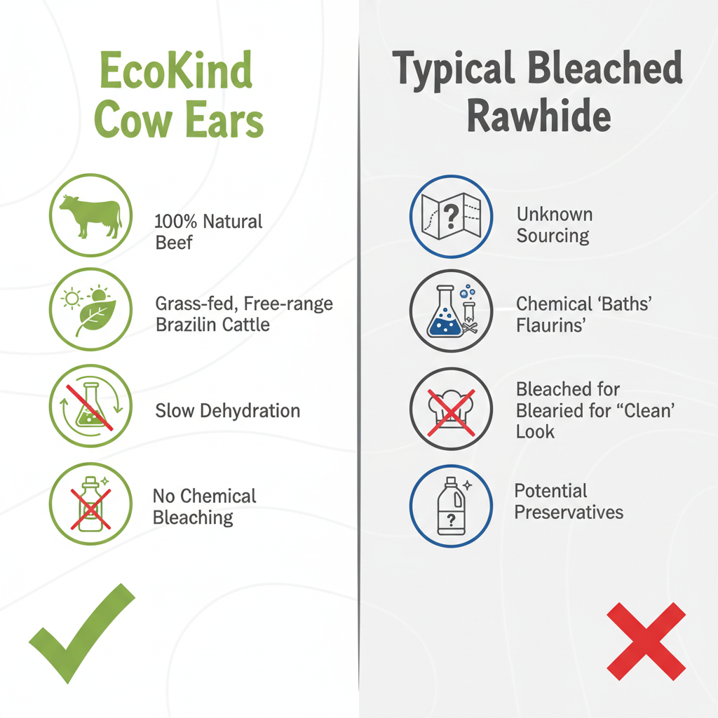 When we look at the source, transparency is key. These chews are made from 100% single-source beef, specifically from free-range, grass-fed Brazilian cattle. Our research shows that Brazilian beef often carries fewer hormonal additives than some domestic mass-market options. The processing is straightforward—there are no chemical "baths" or artificial flavorings. While the specific drying temperature isn't listed on the bag, the texture suggests a slow-dehydration process that preserves the natural collagen and proteins without making the ear brittle or "glassy."