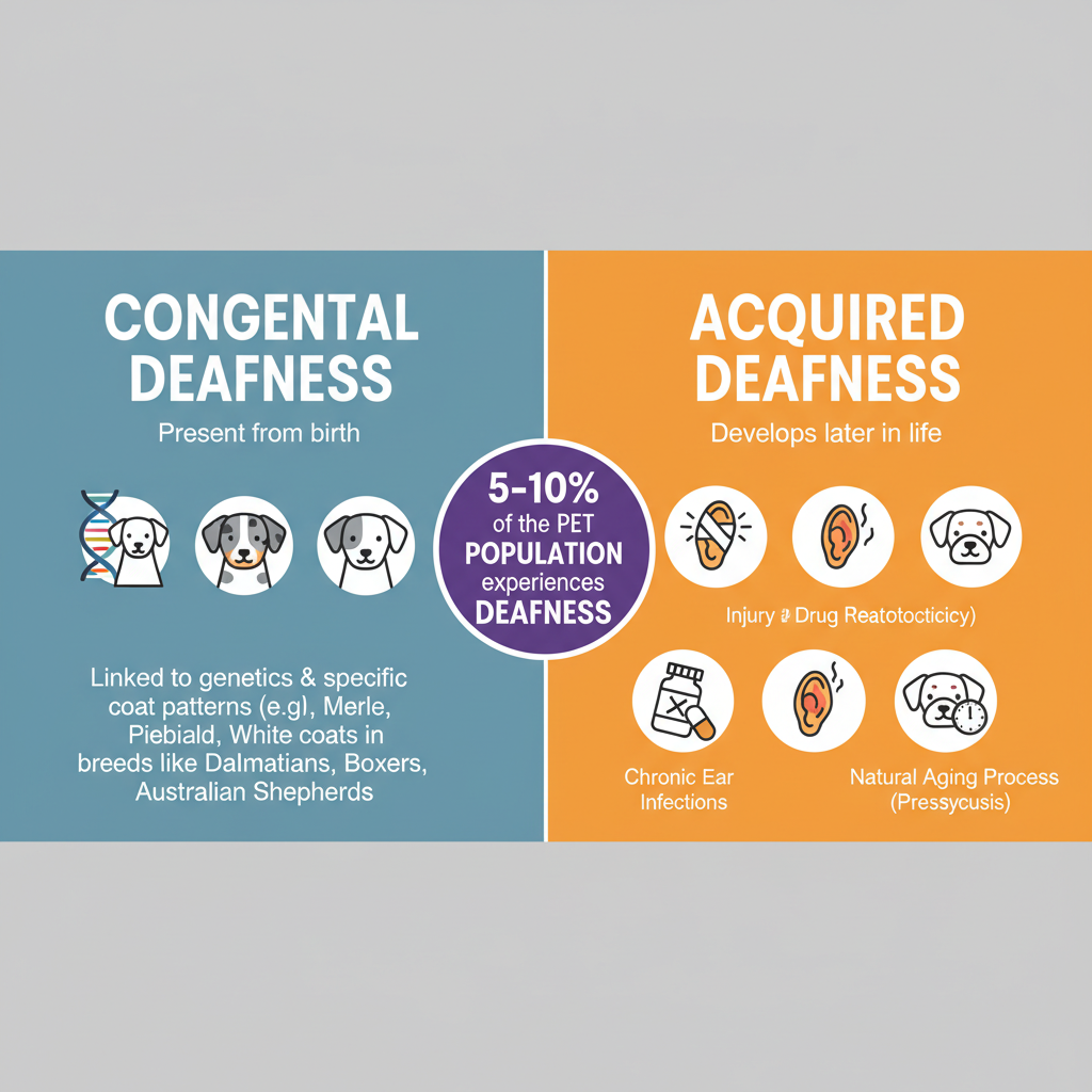Hearing loss in dogs can be either congenital (present from birth) or acquired later in life. Acquired hearing loss may result from injury, adverse drug reactions, or the natural aging process. Congenital deafness often appears early and tends to be linked with certain coat color patterns.
