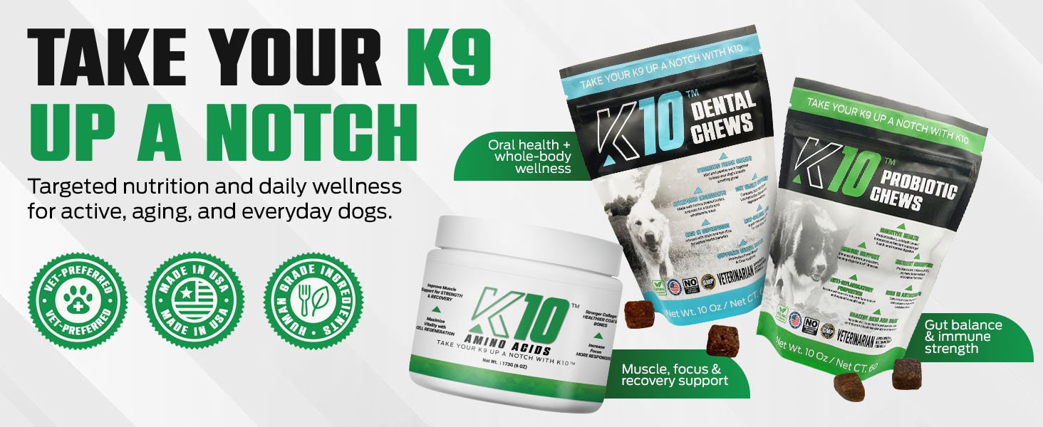 Note: Compound amino acid supplements like K10 Amino Acids for Dogs provide the best results when used consistently. If your pup is recovering from surgery or a long illness, talk to your vet about doubling the dose for the first two weeks to jumpstart the repair process. Always make sure your dog has plenty of fresh water, as amino acids work best when the body is fully hydrated.