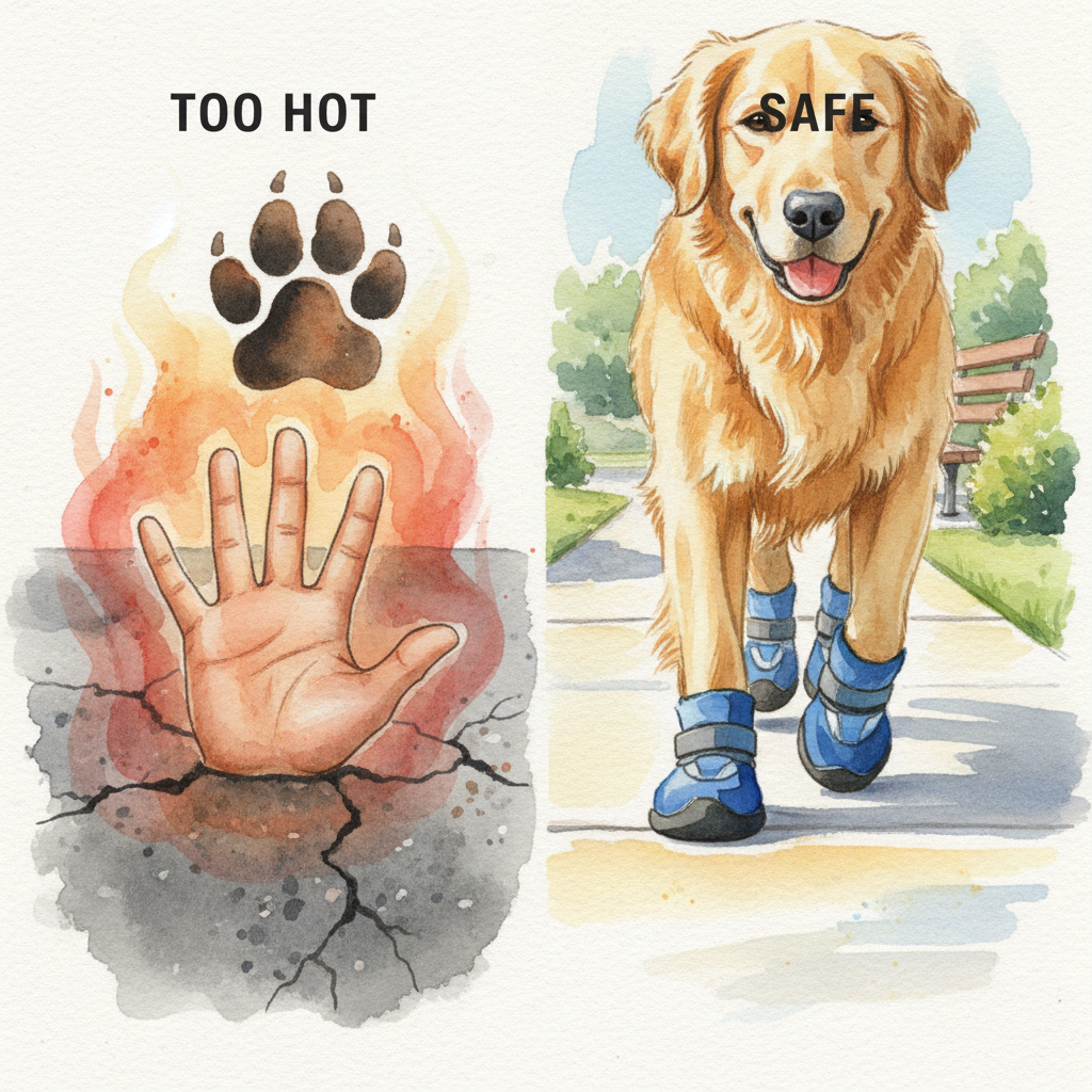 - Test pavement temperature with your palm to prevent paw pad burns.