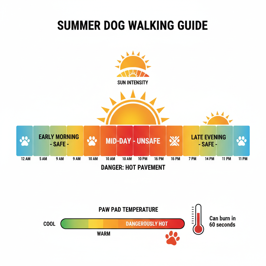 Picking the right time to walk your dog in the summer is vital. Aim for early mornings or late evenings when the air is cooler and the sun less intense. These periods help reduce the risk of overheating and avoid scalded paws from hot pavement.