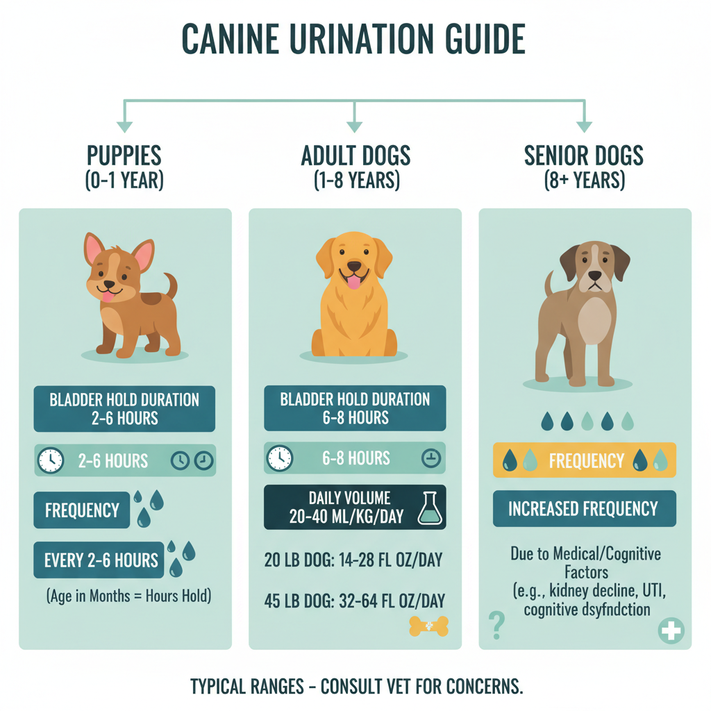 Generally, healthy adult dogs can comfortably hold their urine for 6 to 8 hours. On average, an adult dog produces about 20 to 40 milliliters of urine per kilogram of body weight over a 24-hour period. For example, a 20-pound dog usually urinates roughly 6 to 12 ounces daily, while a 45-pound dog might produce between 14 to 28 ounces.