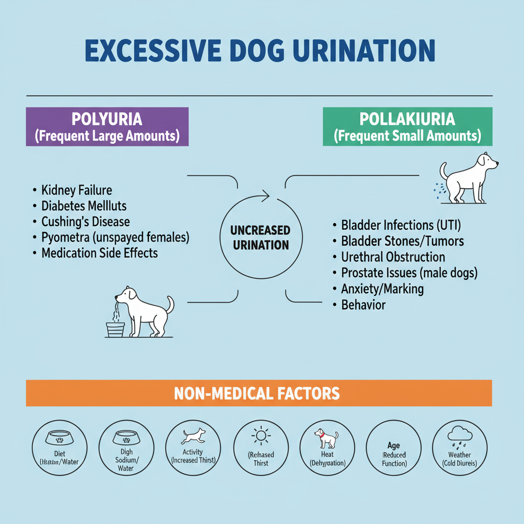 Certain drugs, like diuretics (furosemide, torsemide), anti-seizure medications (phenobarbital), and corticosteroids (prednisone) can cause increased urination and thirst.