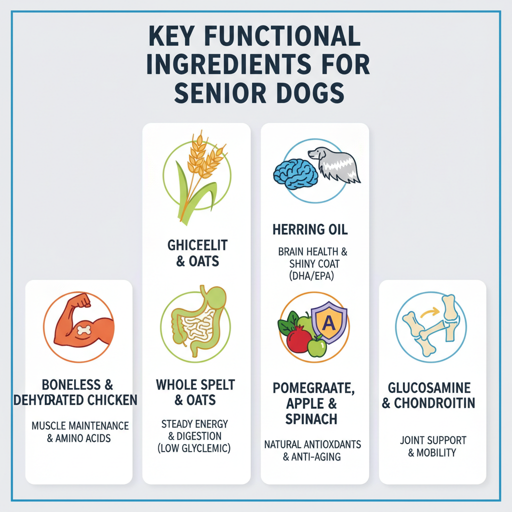 - Whole Spelt & Whole Oats: These "ancestral" grains provide steady energy and fiber, which helps with digestion and keeps your senior pup feeling full longer.