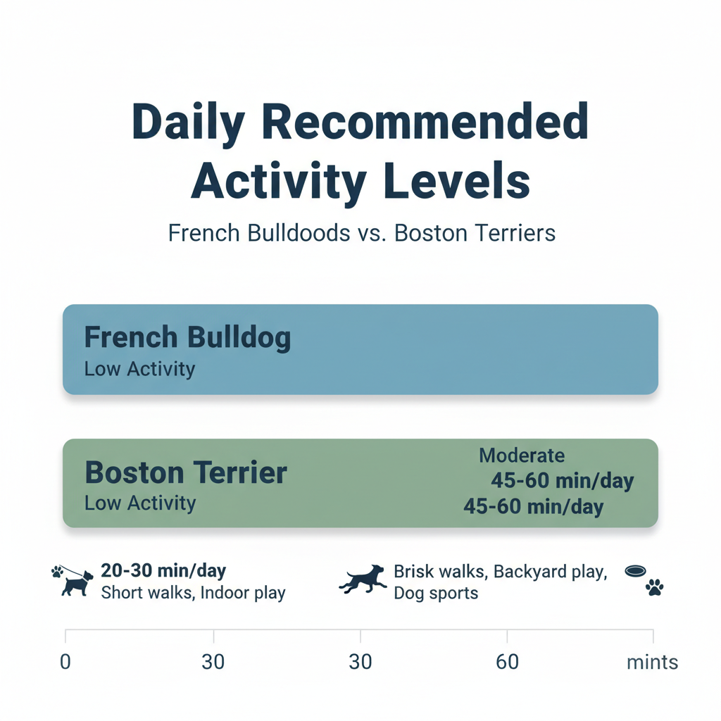 Boston Terriers have a moderate activity level. They love a good walk, playtime in a secure backyard, and can even enjoy dog sports. They handle physical activity better than French Bulldogs but still need your protection from overheating on warm days.