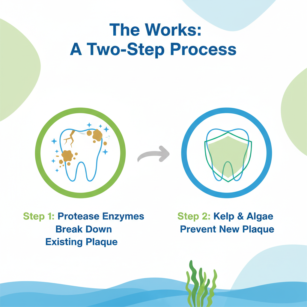 This isn't just flavored dust. The formula uses Protease, an enzyme that actively helps break down protein-based plaque. The inclusion of Brown Algae and Kelp is a smart move; these sea-based ingredients are famous in the pet world for changing the chemistry of saliva to prevent new plaque from sticking.