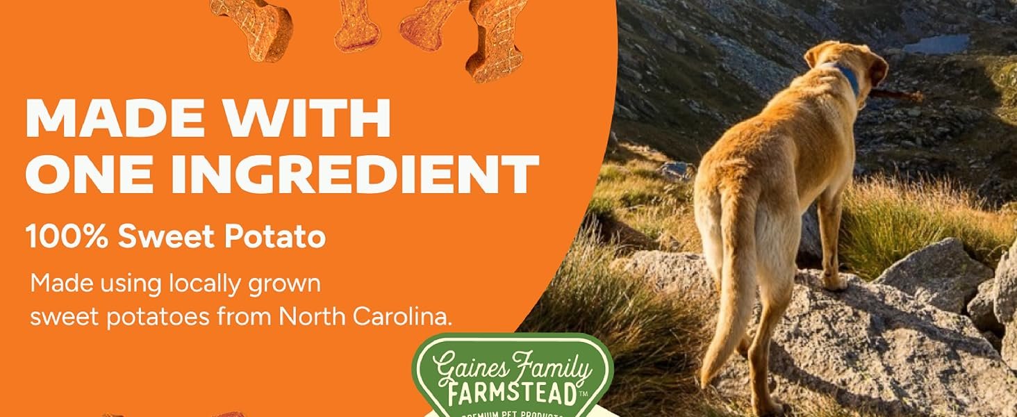 When we look at the label of Gaines Family Farmstead Sweet Potato Dog Bones, the simplicity is refreshing. Our team at Petscarelab confirmed that these treats are 100% single-source, containing nothing but dehydrated sweet potato. There are no hidden fillers, "natural flavors," or mystery binders. The brand prioritizes transparency by sourcing their potatoes directly from local farms in North Carolina. By using a low-temperature dehydration process rather than high-heat industrial baking, the manufacturer manages to preserve the delicate antioxidants, vitamins, and minerals that make sweet potatoes a "superfood" for your pup.