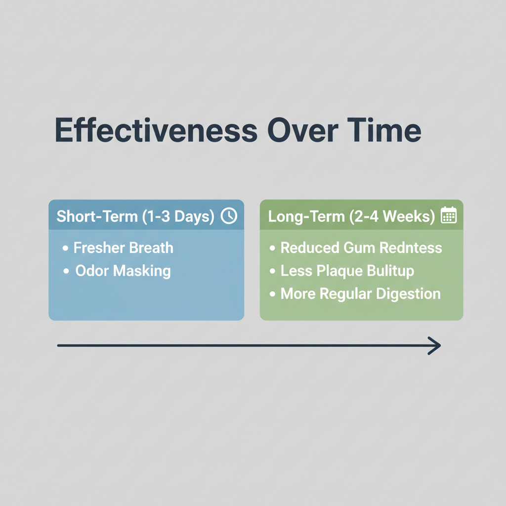 - Short-Term (1-3 Days): The immediate dog breath improved within the first few sessions. The peppermint and ginger help mask the odor, while the mechanical chewing starts to clear away the daily film of bacteria.