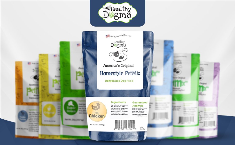 Healthy Dogma Homestyle PetMix Dehydrated Dog Food is a grain-free, US-made meal designed for adult dogs of all breeds struggling with food allergies, featuring farm-raised chicken in a simple, "just-add-water" flake format.