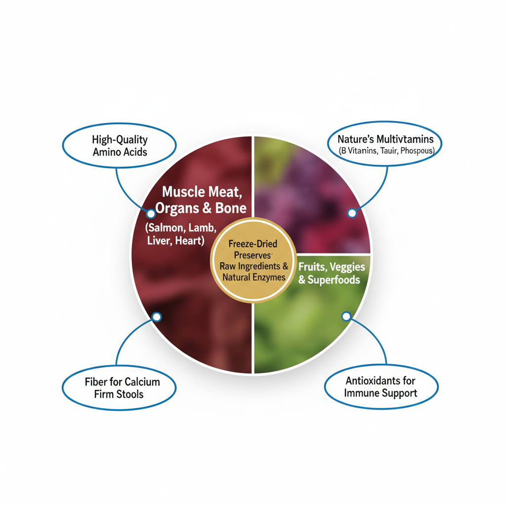 ✔️ Contains 85% real meat, organs, and bones with 15% fruits and vegetables, all nutritionally preserved through freeze-drying.