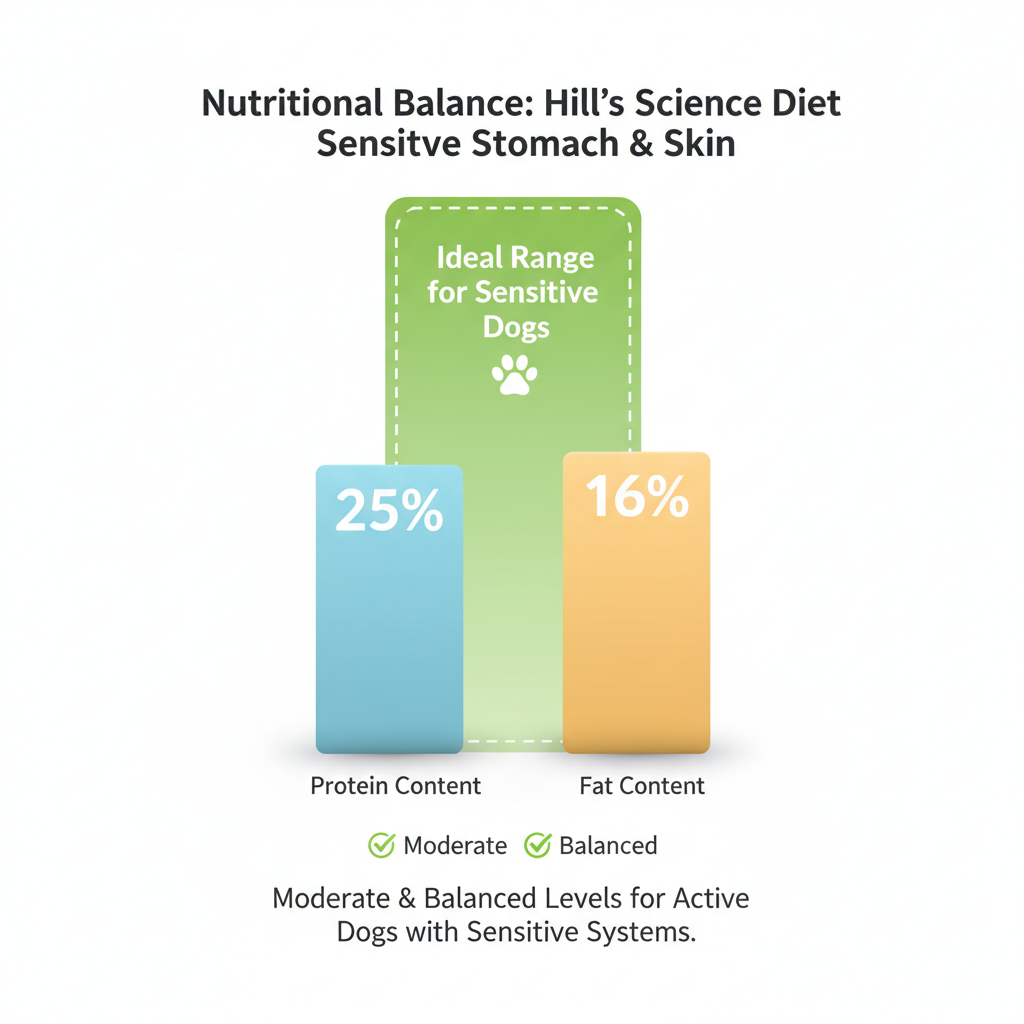 Hill's Science Diet Sensitive Stomach & Skin hits a sweet spot for nutritional balance. The protein level (around 25%) is perfect for an average adult dog—not so high that it overburdens the kidneys, but enough to support an active lifestyle.